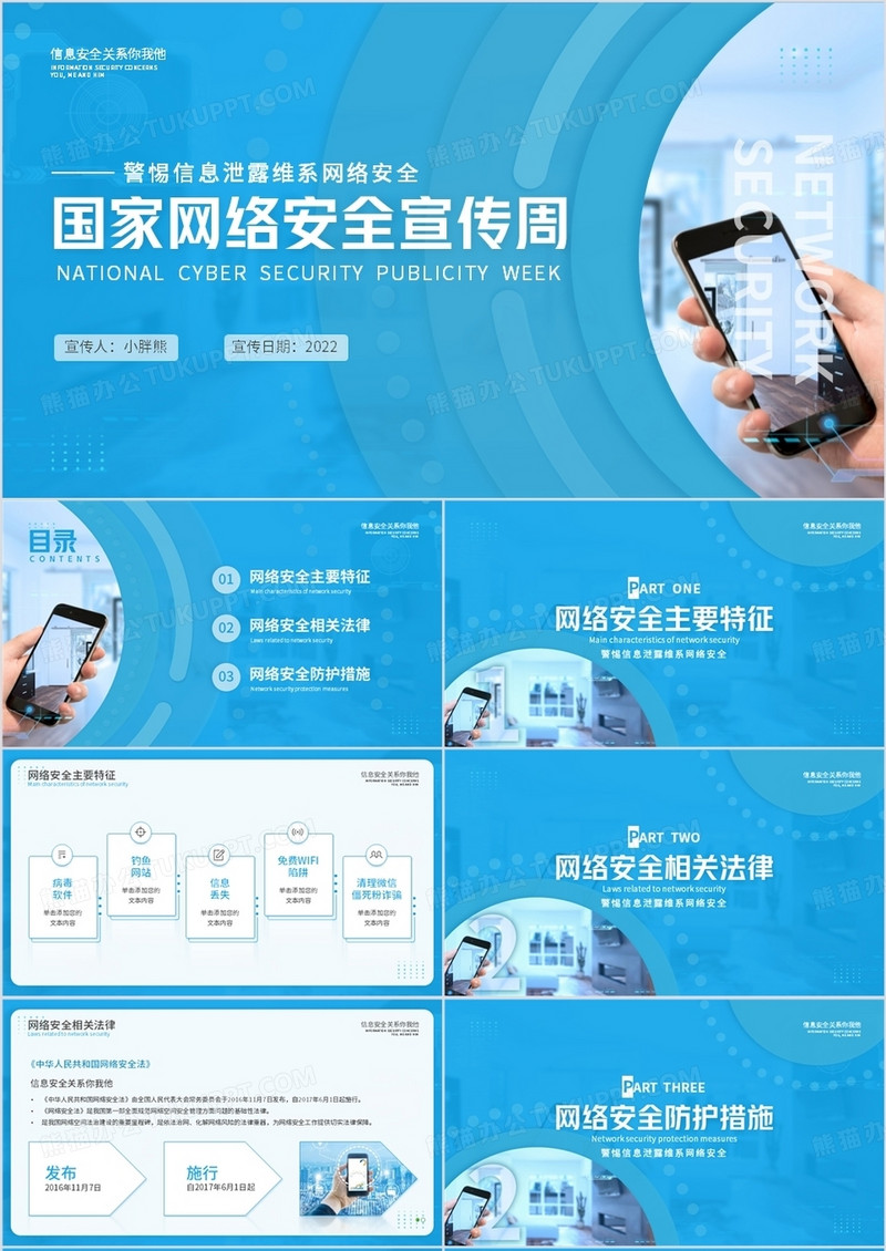 本作品为蓝色商务风国家网络安全宣传周PPT模板, 编号:0ayknwjy79, 格式为 pptx, 大小11 MB, 本作品下载后,先解压,解压之后用推荐软件 PowerPoint(2019) 打开, 然后进行编辑功能。