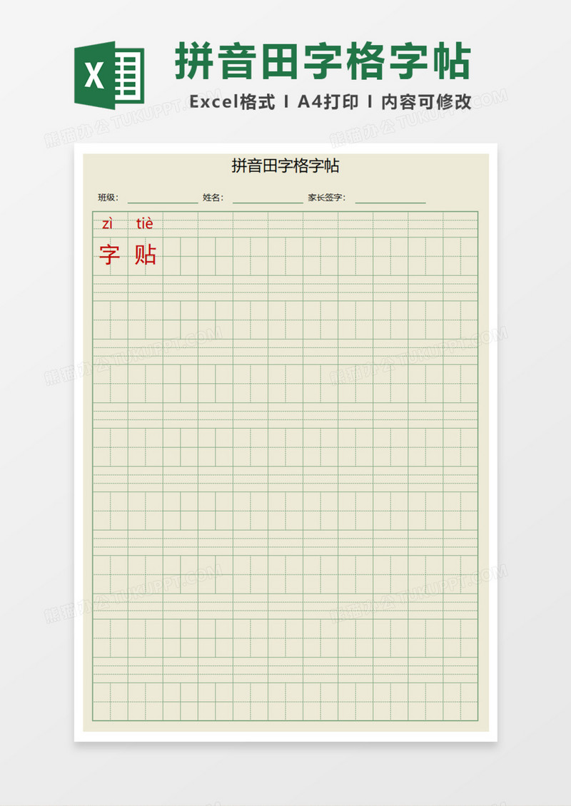 本作品为拼音田字格字帖Excel模板, 编号:313e37k5p9, 格式为 xlsx, 大小1 MB, 本作品下载后,先解压,解压之后用推荐软件 Excel(2016) 打开, 然后进行编辑功能。