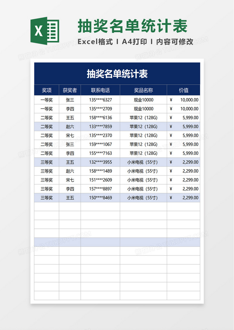 本作品为抽奖名单统计表excel模板, 编号:313e3g2ky9, 格式为 xlsx, 大小1 MB, 本作品下载后,先解压,解压之后用推荐软件 Excel(2016) 打开, 然后进行编辑功能。
