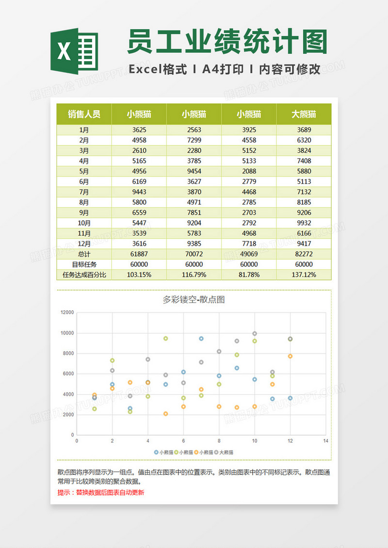 本作品为绿色镂空员工业绩统计散点图Excel模板, 编号:6187rjely9, 格式为 xlsx, 大小1 MB, 本作品下载后,先解压,解压之后用推荐软件 Excel(2016) 打开, 然后进行编辑功能。