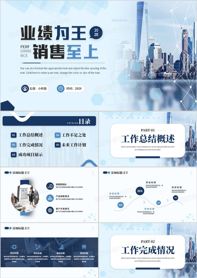 本作品为蓝色简约风业绩为王销售至上PPT模板, 编号:618onm5m6a, 格式为 pptx, 大小22 MB, 本作品下载后,先解压,解压之后用推荐软件 PowerPoint(2016) 打开, 然后进行编辑功能。