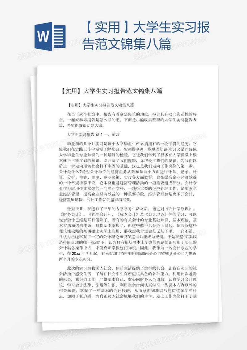 本作品为【实用】大学生实习报告范文锦集八篇, 编号:daen3230ra, 格式为 docx, 大小1 MB, 本作品下载后,先解压,解压之后用推荐软件 Word(2010) 打开, 然后进行编辑功能。