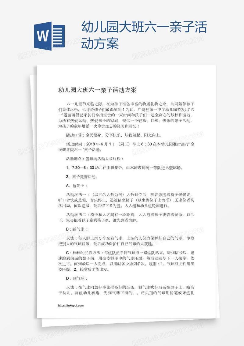 本作品为幼儿园大班六一亲子活动方案, 编号:daenwng3da, 格式为 docx, 大小1 MB, 本作品下载后,先解压,解压之后用推荐软件 Word(2010) 打开, 然后进行编辑功能。