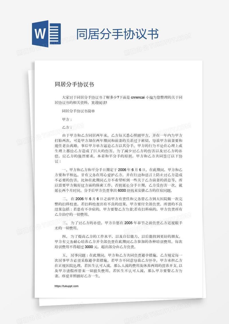 本作品为同居分手协议书, 编号:daenwr5vva, 格式为 docx, 大小1 MB, 本作品下载后,先解压,解压之后用推荐软件 Word(2010) 打开, 然后进行编辑功能。