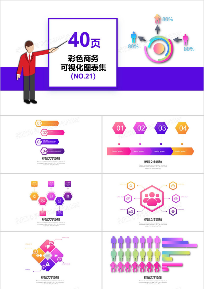 本作品为40页彩色商务可视化图表集PPT模板, 编号:g9rv5d4yw1, 格式为 pptx, 大小7 MB, 本作品下载后,先解压,解压之后用推荐软件 PowerPoint(2019) 打开, 然后进行编辑功能。