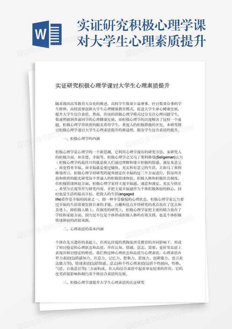 本作品为实证研究积极心理学课对大学生心理素质提升, 编号:k1b2k6j4b1, 格式为 docx, 大小1 MB, 本作品下载后,先解压,解压之后用推荐软件 Word(2010) 打开, 然后进行编辑功能。