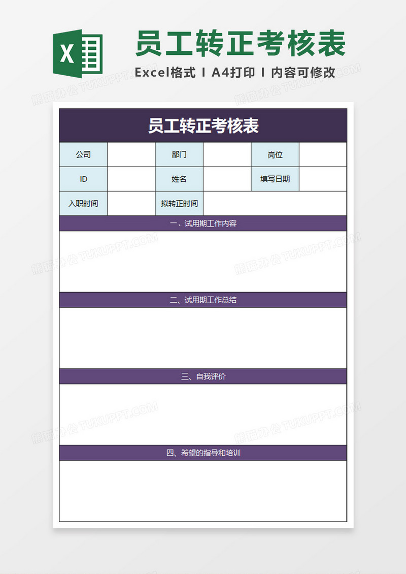 本作品为简洁员工转正考核表excel模板, 编号:k9g54on081, 格式为 xlsx, 大小1 MB, 本作品下载后,先解压,解压之后用推荐软件 Excel(2016) 打开, 然后进行编辑功能。