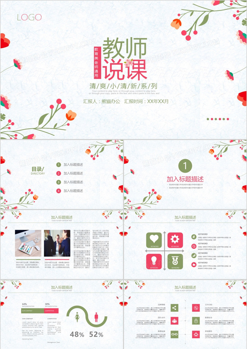 本作品为简约小清新教师说课计划课件PPT模板, 编号:o0ayvvbka5, 格式为 pptx, 大小14 MB, 本作品下载后,先解压,解压之后用推荐软件 PowerPoint(2010) 打开, 然后进行编辑功能。