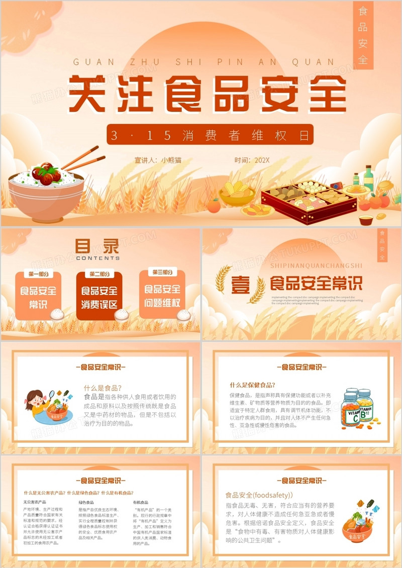 本作品为橙色卡通风关注食品安全PPT动态模板, 编号:q1ow3pg5n9, 格式为 pptx, 大小21 MB, 本作品下载后,先解压,解压之后用推荐软件 PowerPoint(2019) 打开, 然后进行编辑功能。