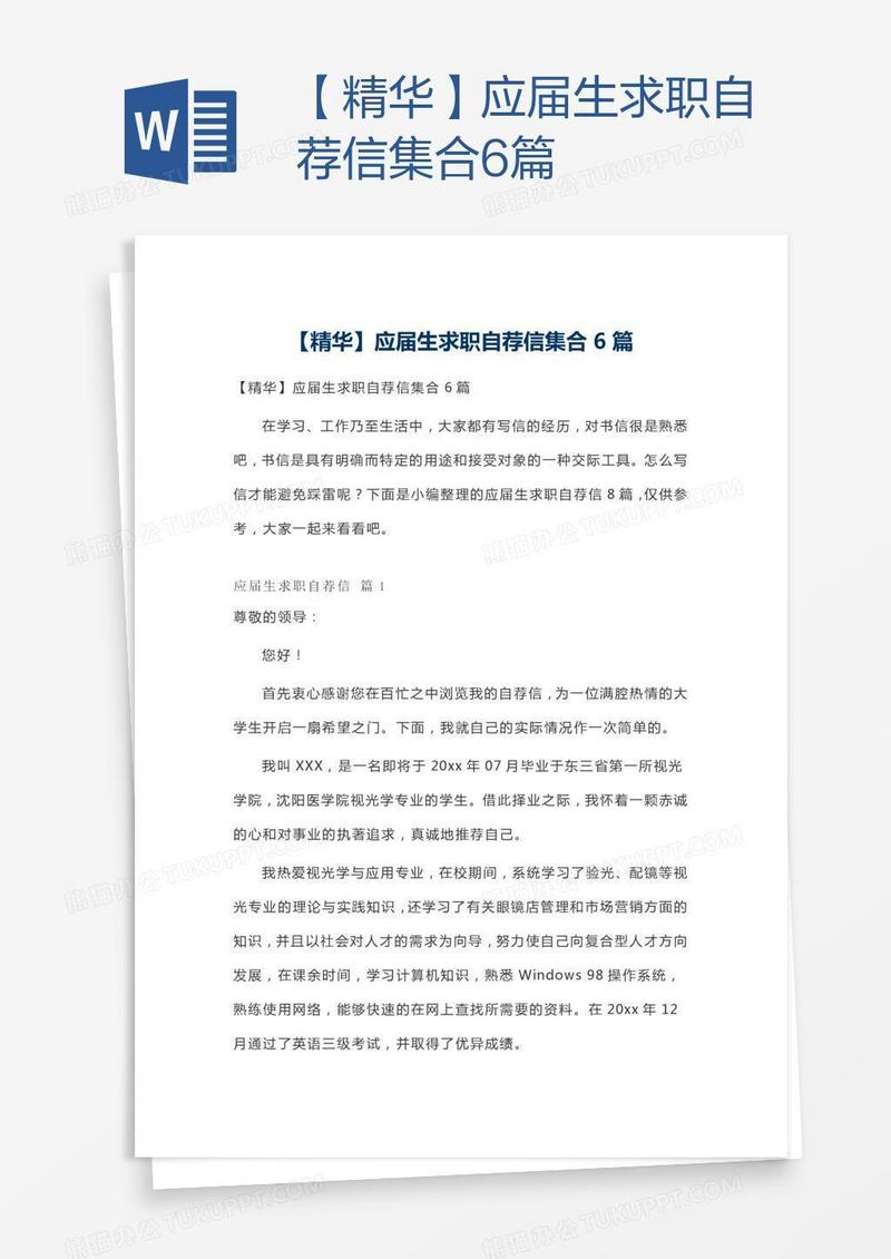 本作品为【精华】应届生求职自荐信集合6篇, 编号:r1p3bjqvb9, 格式为 docx, 大小1 MB, 本作品下载后,先解压,解压之后用推荐软件 Word(2010) 打开, 然后进行编辑功能。
