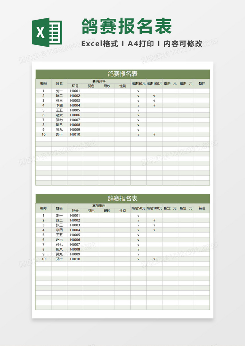 本作品为鸽赛报名表Execl模板, 编号:r1p3nd02b9, 格式为 xls, 大小1 MB, 本作品下载后,先解压,解压之后用推荐软件 Excel(2016) 打开, 然后进行编辑功能。