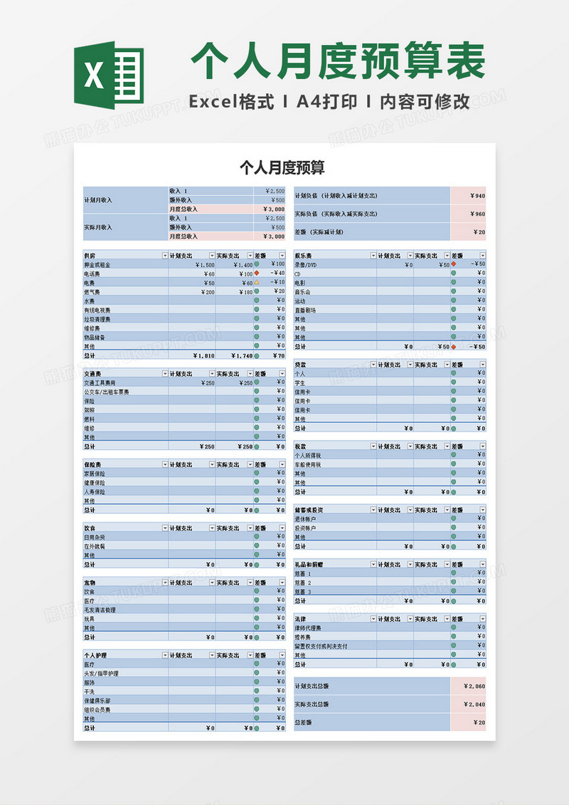 本作品为个人月度预算表excel模板, 编号:w94gpqjbn9, 格式为 xls, 大小1 MB, 本作品下载后,先解压,解压之后用推荐软件 Excel(2016) 打开, 然后进行编辑功能。