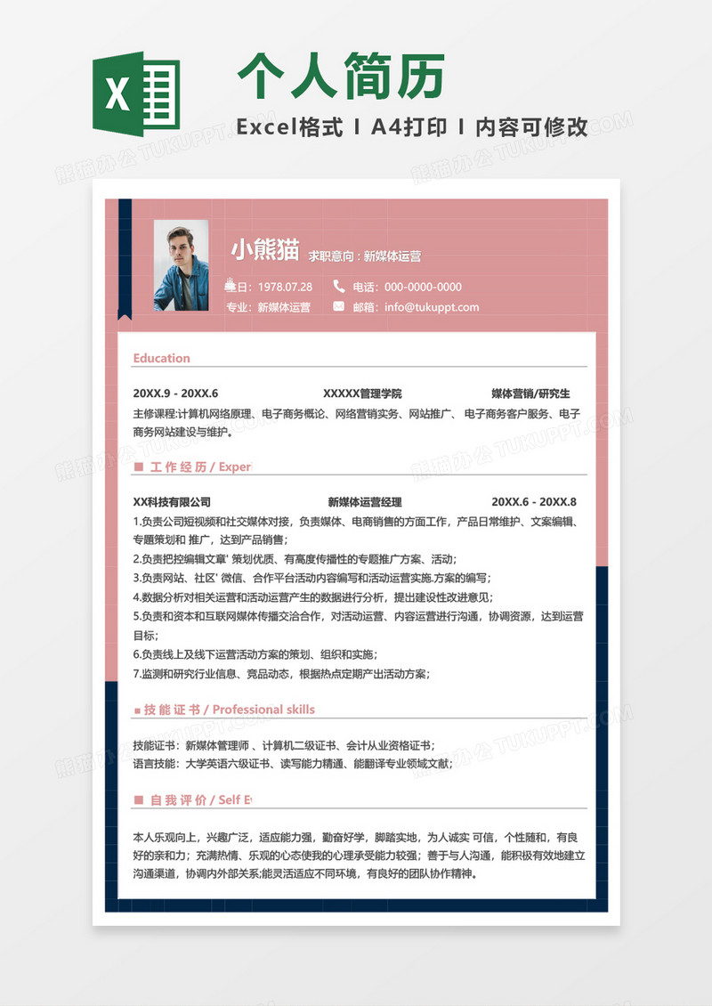 本作品为粉色商务新媒体运营求职简历EXCEL模板, 编号:w94gqn3nn9, 格式为 xlsx, 大小4 MB, 本作品下载后,先解压,解压之后用推荐软件 Excel() 打开, 然后进行编辑功能。