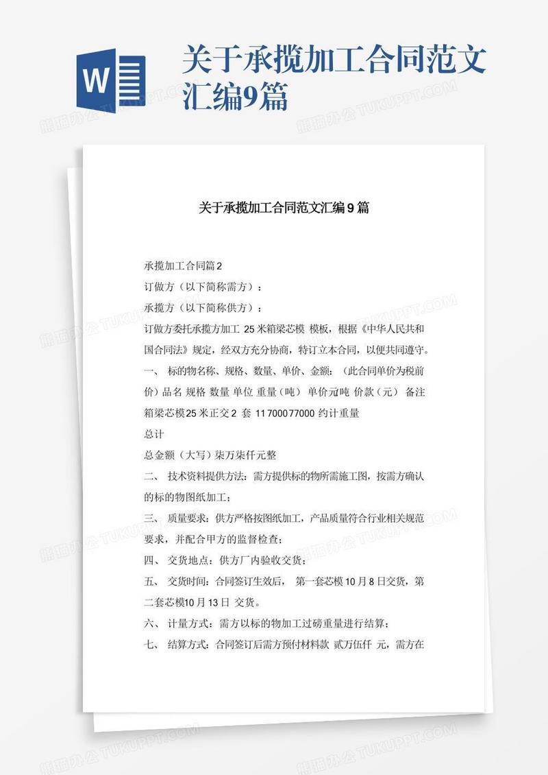 本作品为关于承揽加工合同范文汇编9篇, 编号:w94gqnqnl9, 格式为 docx, 大小1 MB, 本作品下载后,先解压,解压之后用推荐软件 Word(2010) 打开, 然后进行编辑功能。