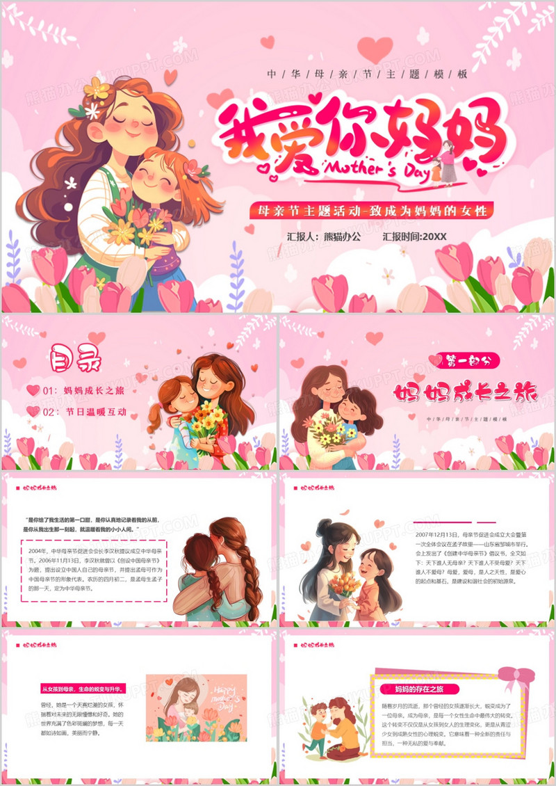 本作品为粉色卡通风我爱你妈妈母亲节PPT模板, 编号:w9j887ndg1, 格式为 pptx, 大小35 MB, 本作品下载后,先解压,解压之后用推荐软件 PowerPoint(2016) 打开, 然后进行编辑功能。