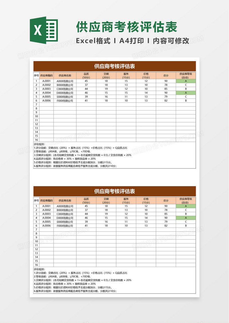 本作品为供应商考核评估表excel模板, 编号:w9ke0lny49, 格式为 xlsx, 大小1 MB, 本作品下载后,先解压,解压之后用推荐软件 Excel(2016) 打开, 然后进行编辑功能。