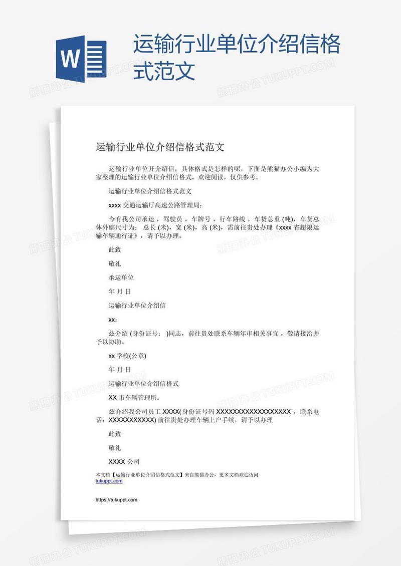 本作品为运输行业单位介绍信格式范文, 编号:w9keqr7lp9, 格式为 docx, 大小1 MB, 本作品下载后,先解压,解压之后用推荐软件 Word(2010) 打开, 然后进行编辑功能。